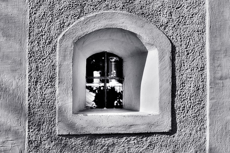 Das Streiflicht der Mittagssonne hebt die Mauerstruktur um das Fenster hervor. Dieses Fenster findet man erst nach einem Spaziergang in einen von Inzings Weilern. Ein kleiner Hinweis noch: Es gehört nicht, wie man vermuten könnte, zu einem alten Bauernhaus.